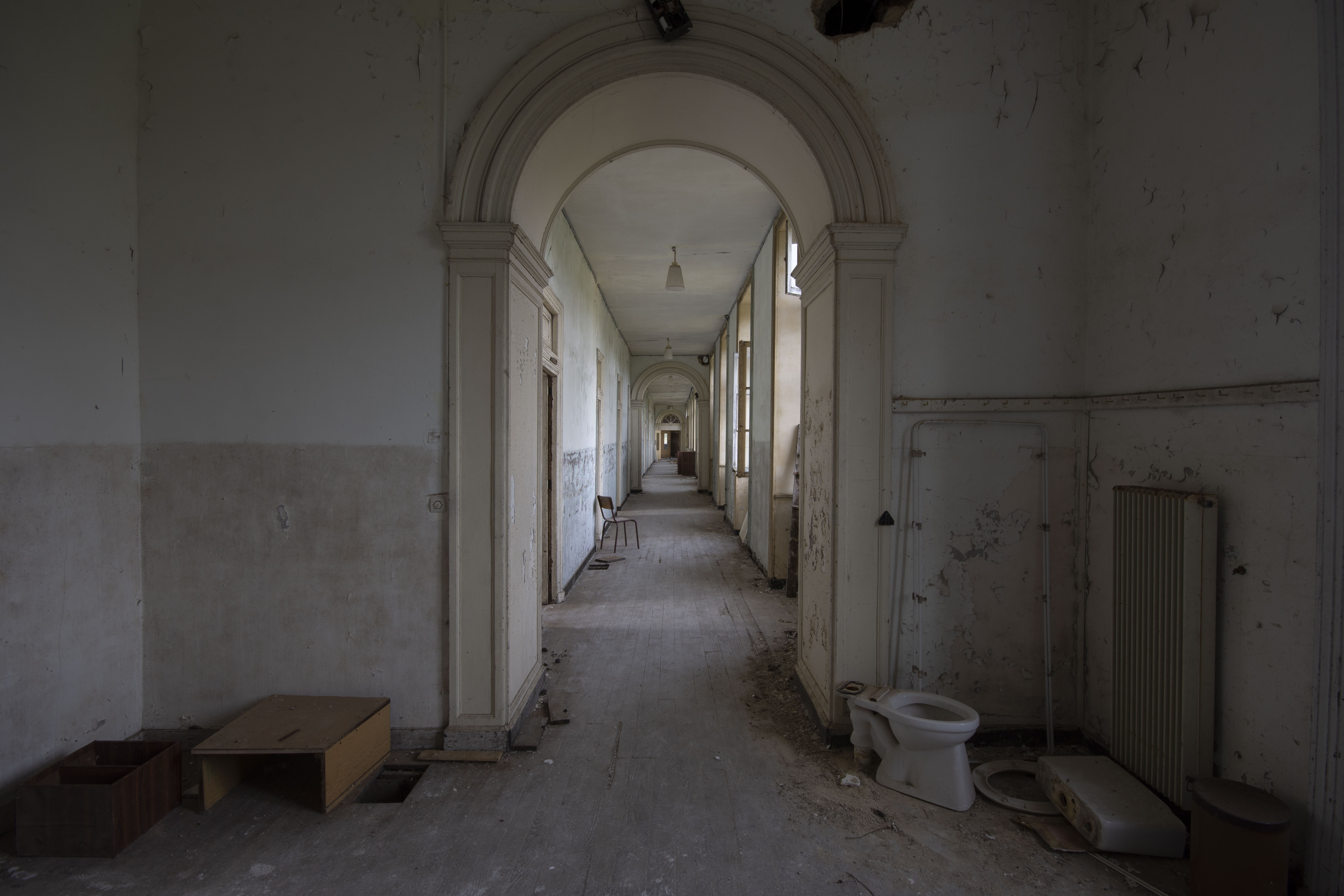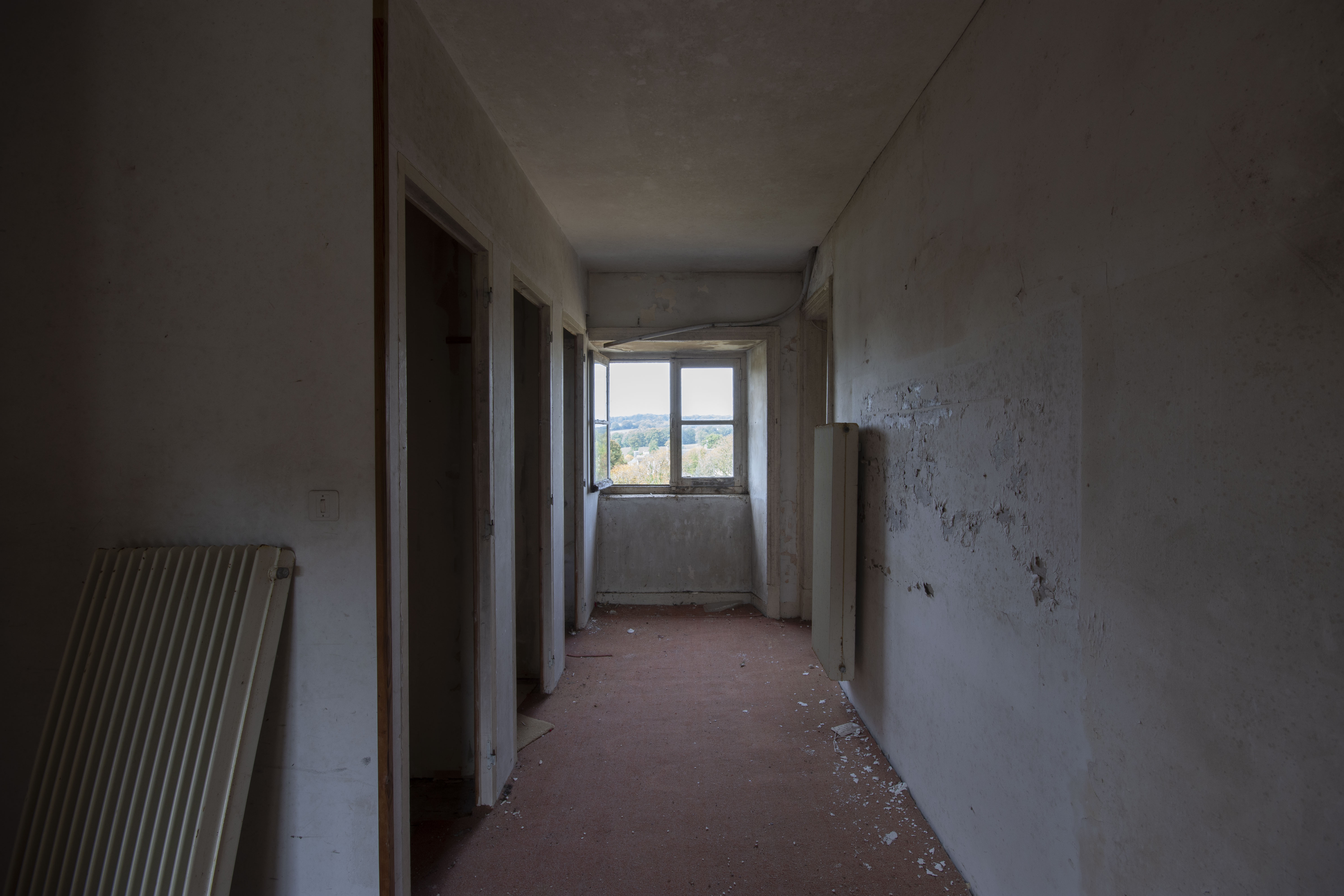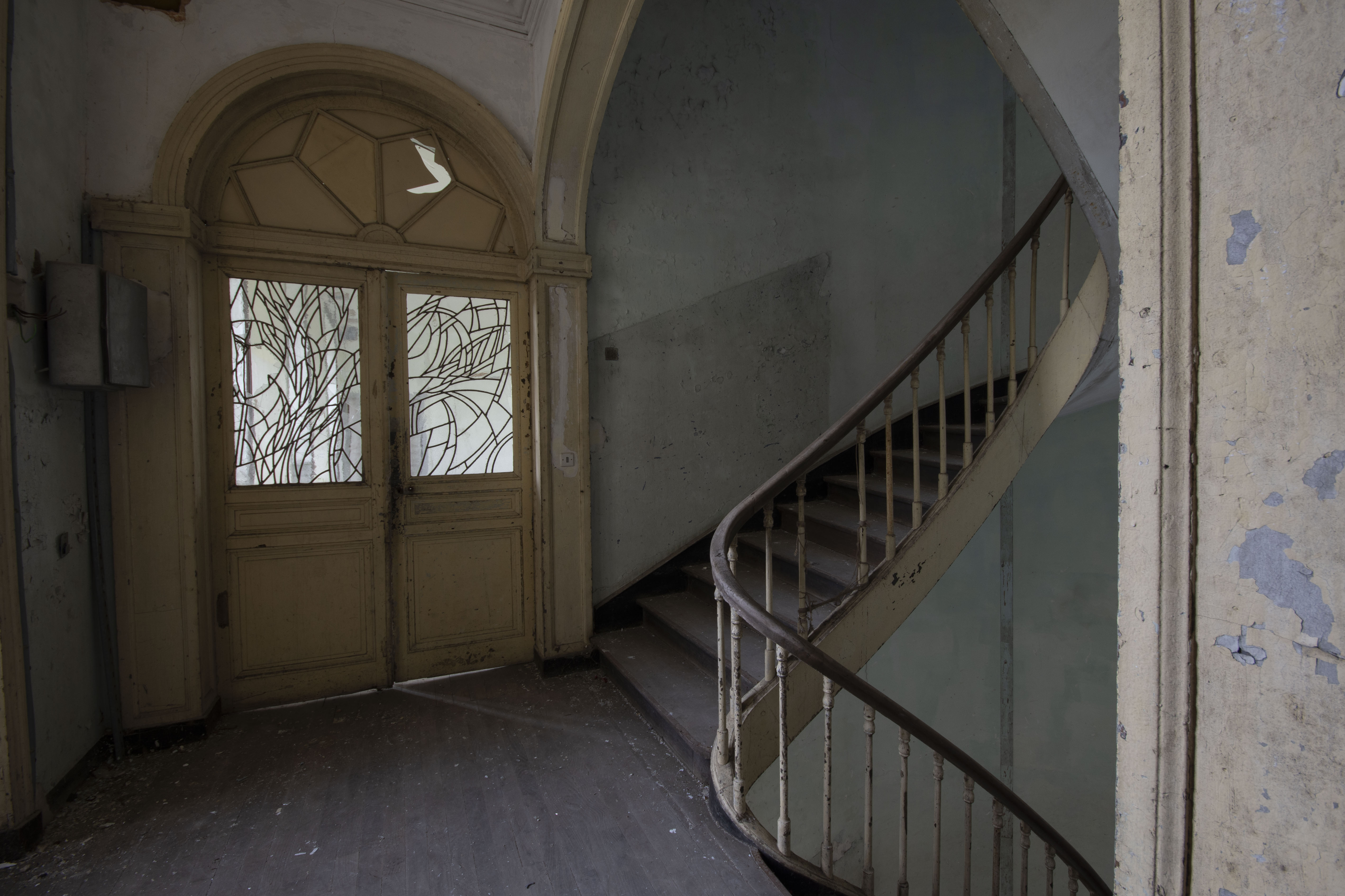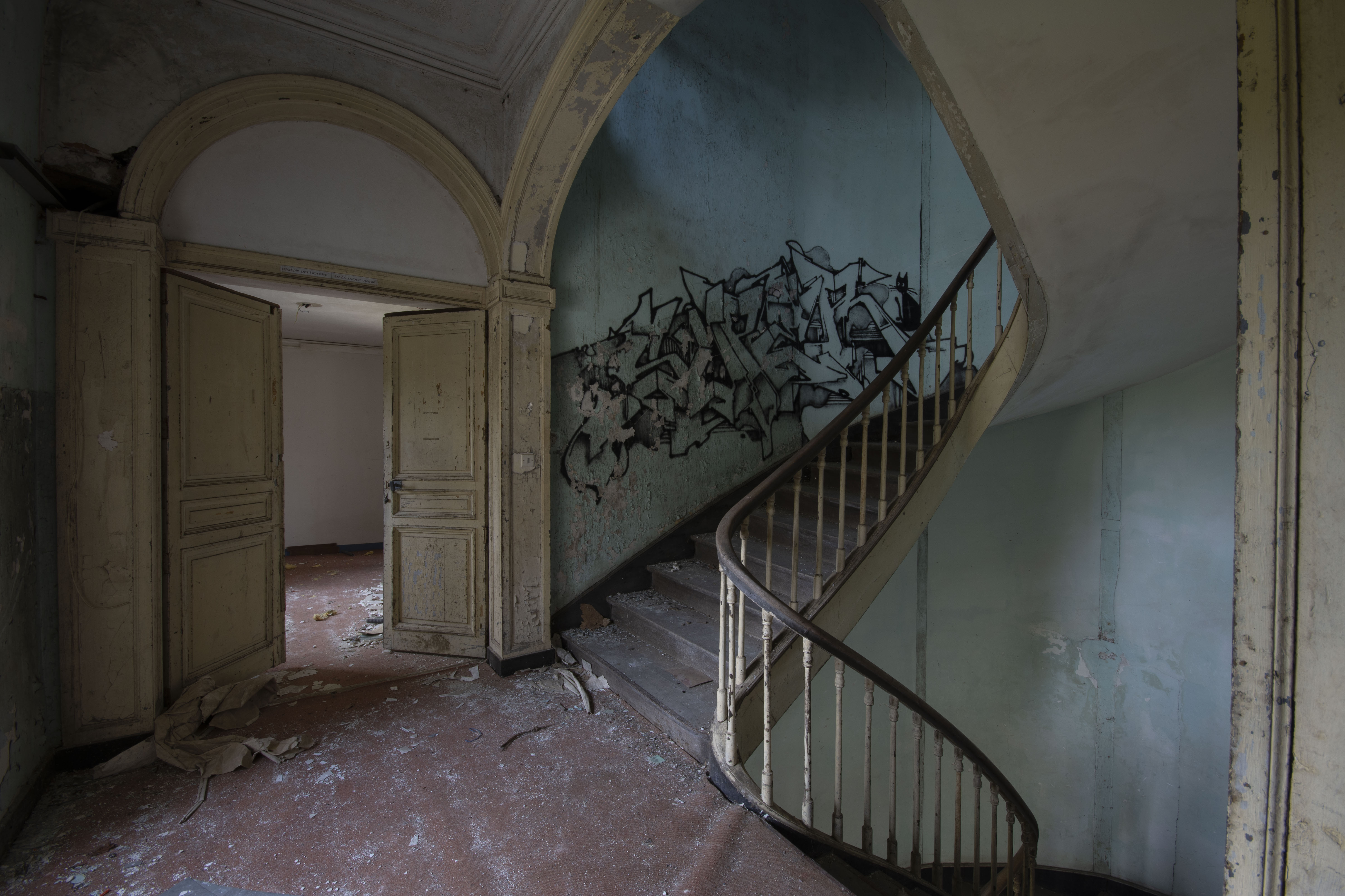 THE EXPLORE: I stopped by the Abbaye Blanche on my way to see some friends, after seeing the Chapelle des Pelotes. A little theme of religious buildings, I know! But still, the thought of exploring a derelict 12th century abbey? Tantalising. I parked up and headed over to the abbey, the buildings looming over the road. I found my way in pretty quickly and began snapping away. The upper three floors of the 19th century seminary buildings were evidently modernised during the late 20th century as they have hundreds of rooms with en-suite bathrooms. However, the further down you got, the better the building got. The library and one of the principal reception rooms boasted some very fine carved pannelling and fireplaces. Fine oval staircases wound their way up various spots of the building.