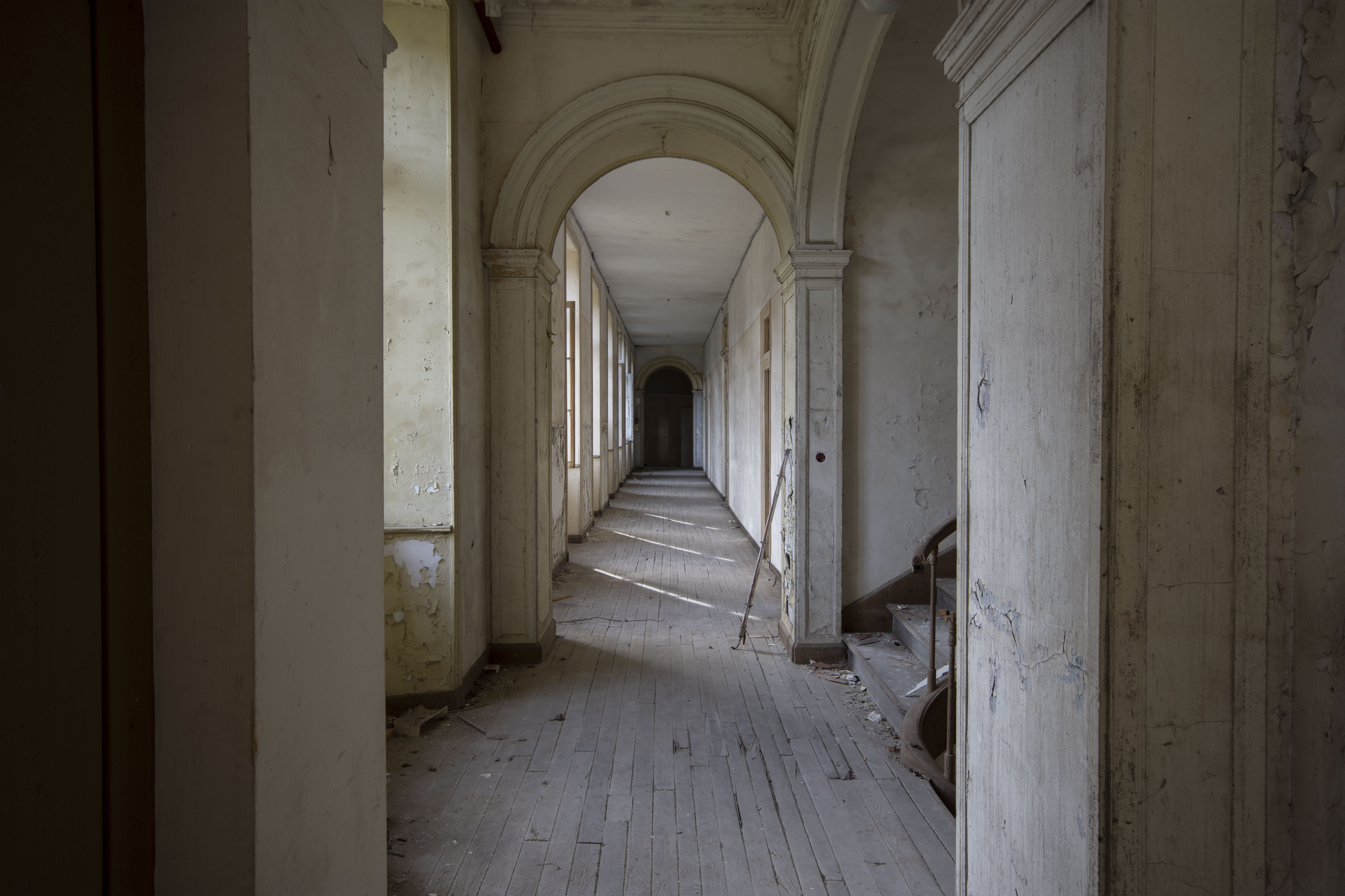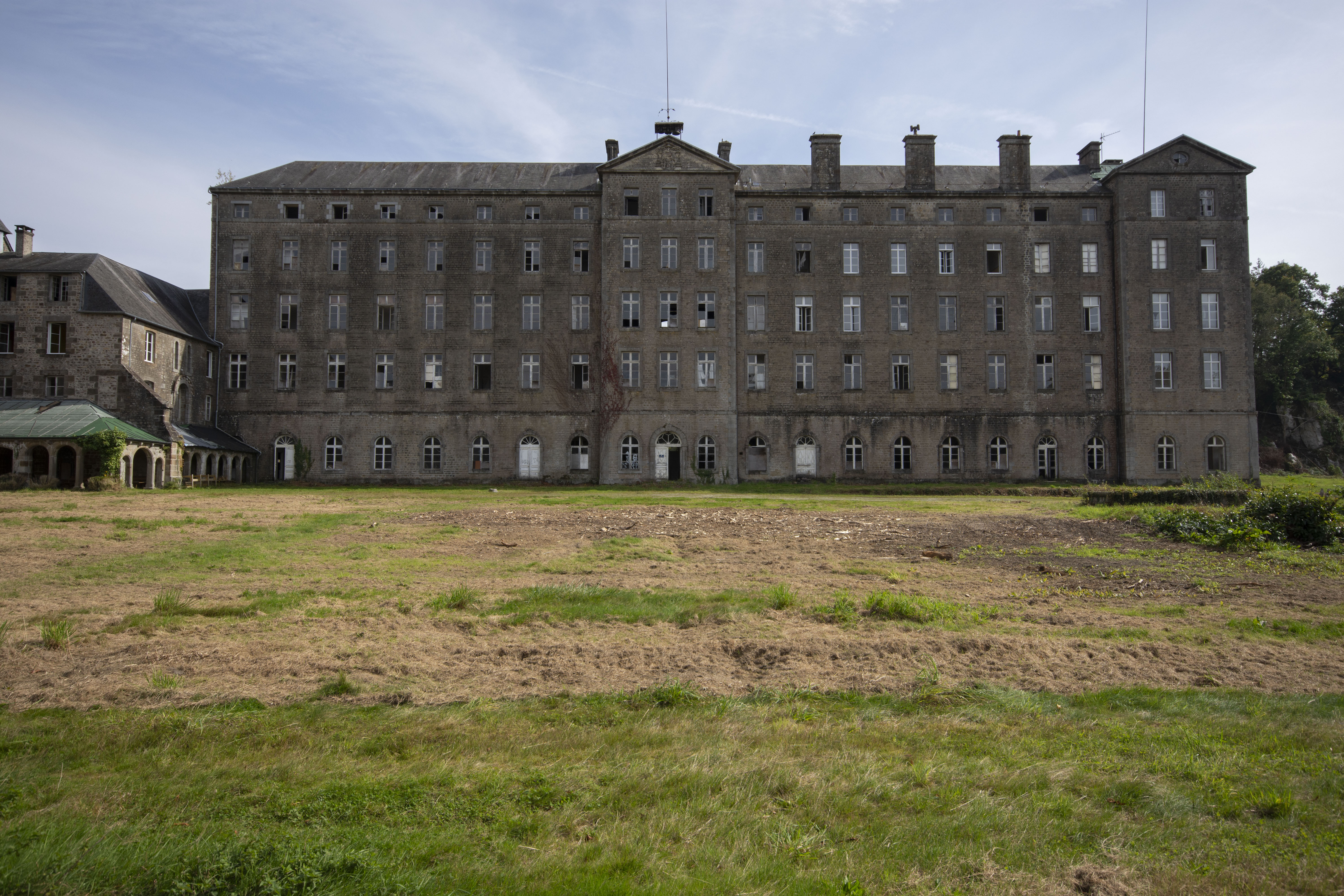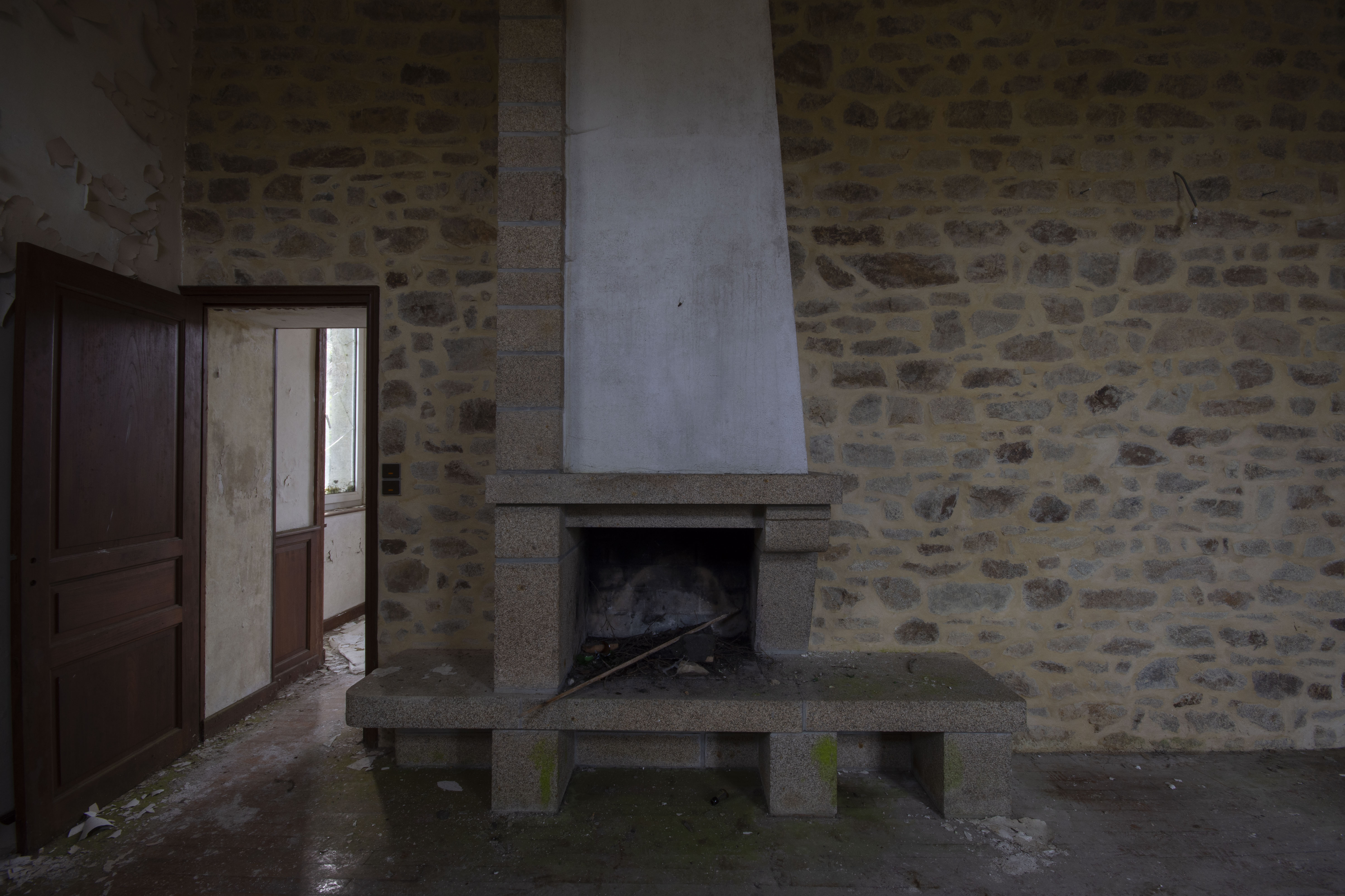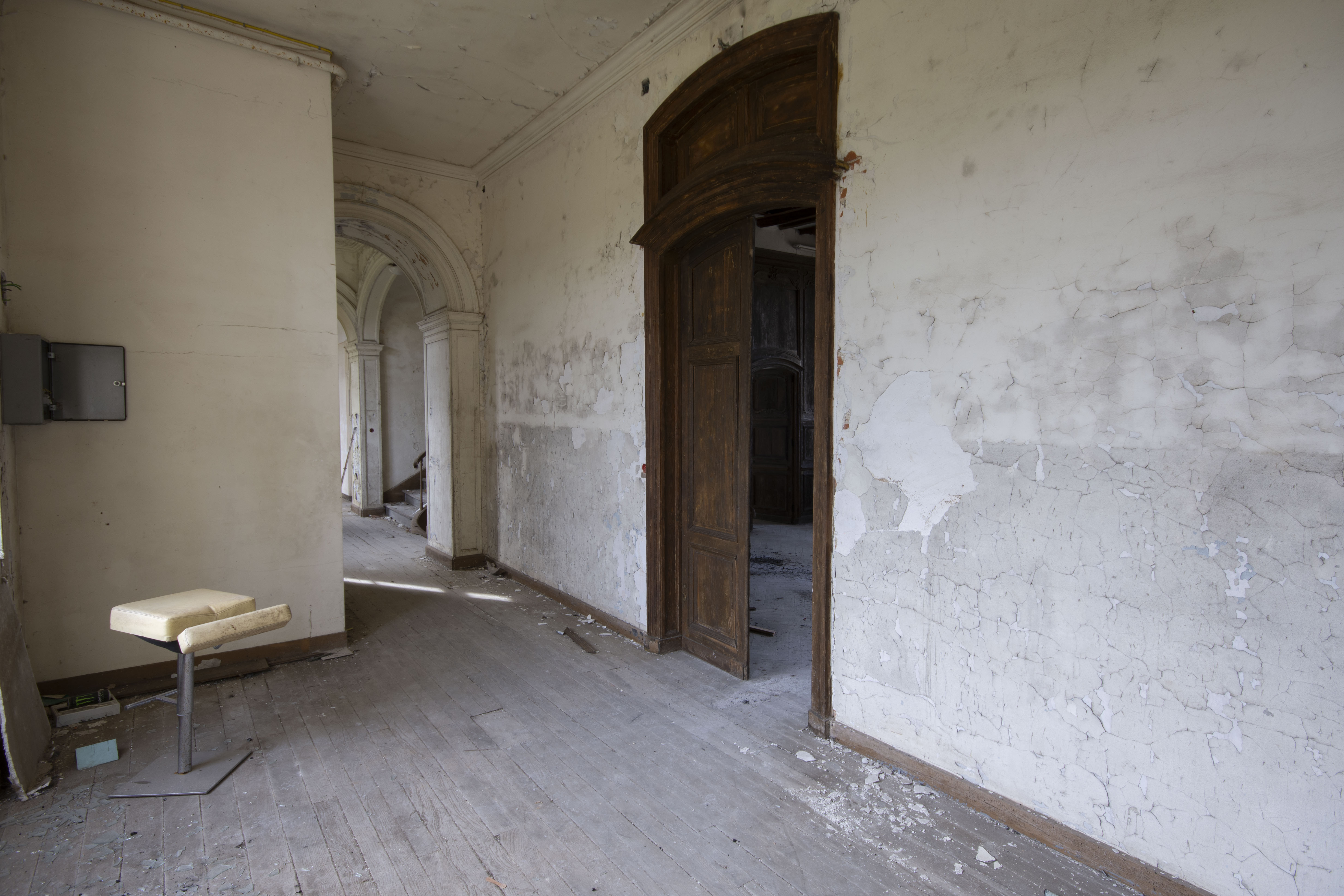 THE EXPLORE: I stopped by the Abbaye Blanche on my way to see some friends, after seeing the Chapelle des Pelotes. A little theme of religious buildings, I know! But still, the thought of exploring a derelict 12th century abbey? Tantalising. I parked up and headed over to the abbey, the buildings looming over the road. I found my way in pretty quickly and began snapping away. The upper three floors of the 19th century seminary buildings were evidently modernised during the late 20th century as they have hundreds of rooms with en-suite bathrooms. However, the further down you got, the better the building got. The library and one of the principal reception rooms boasted some very fine carved pannelling and fireplaces. Fine oval staircases wound their way up various spots of the building.