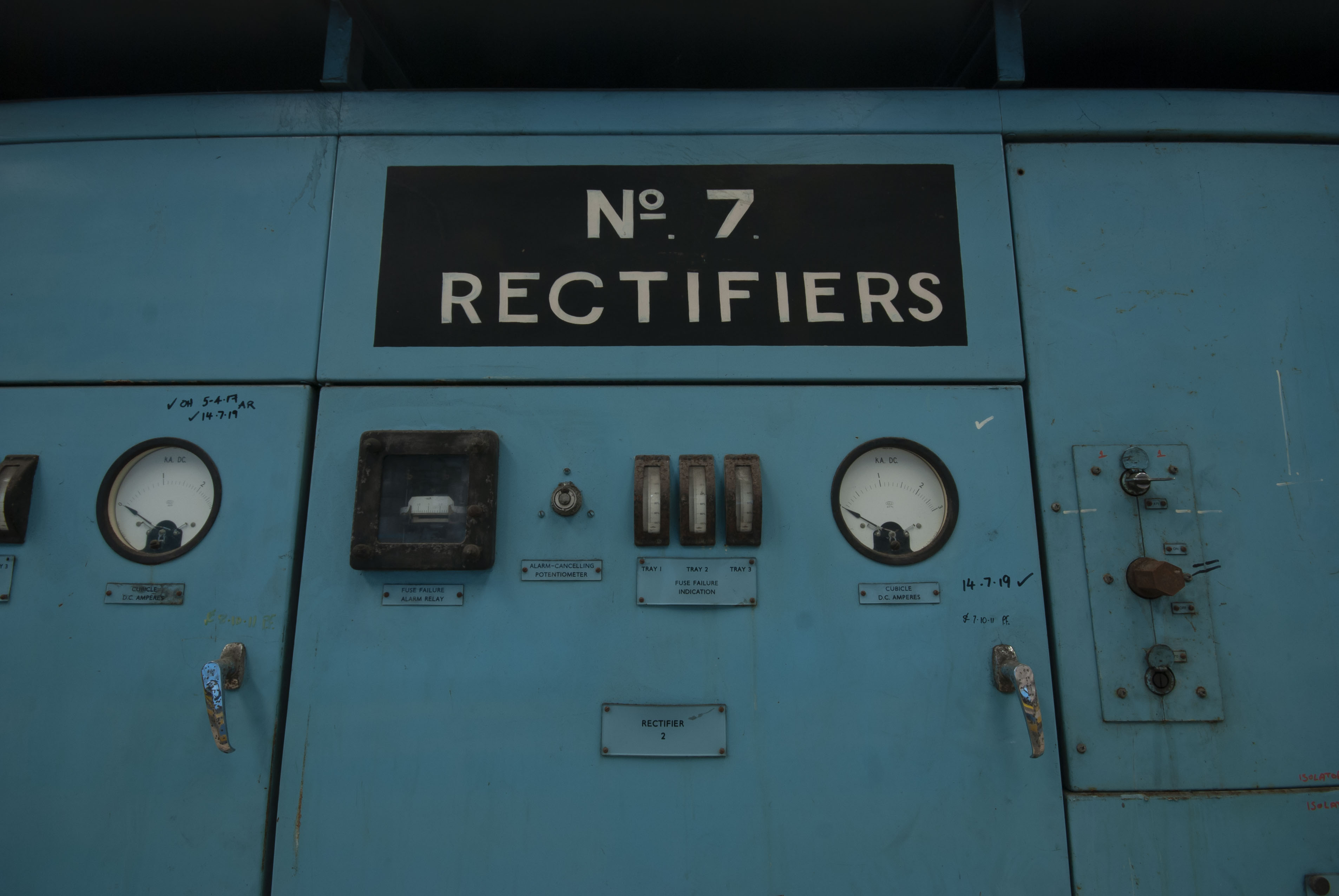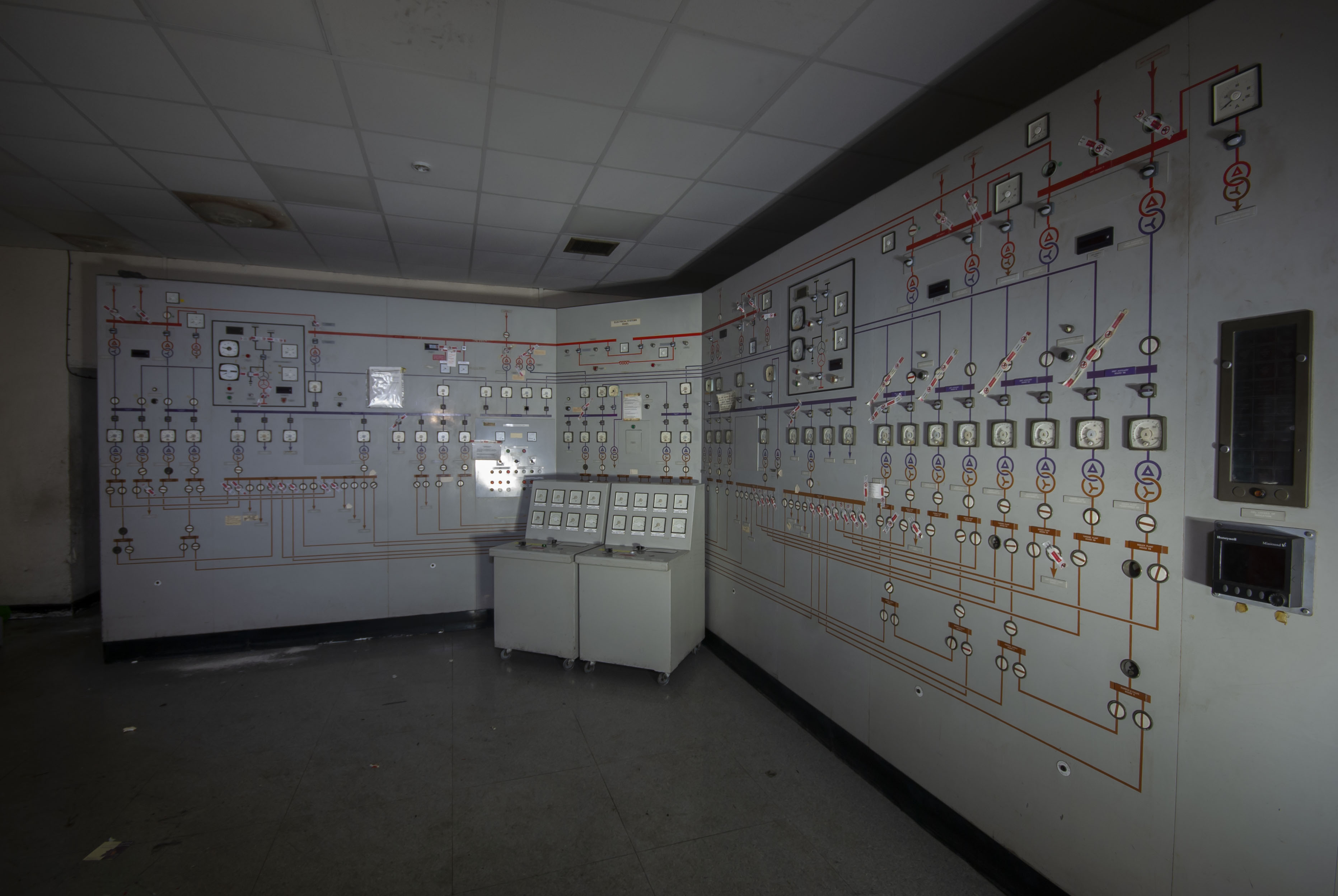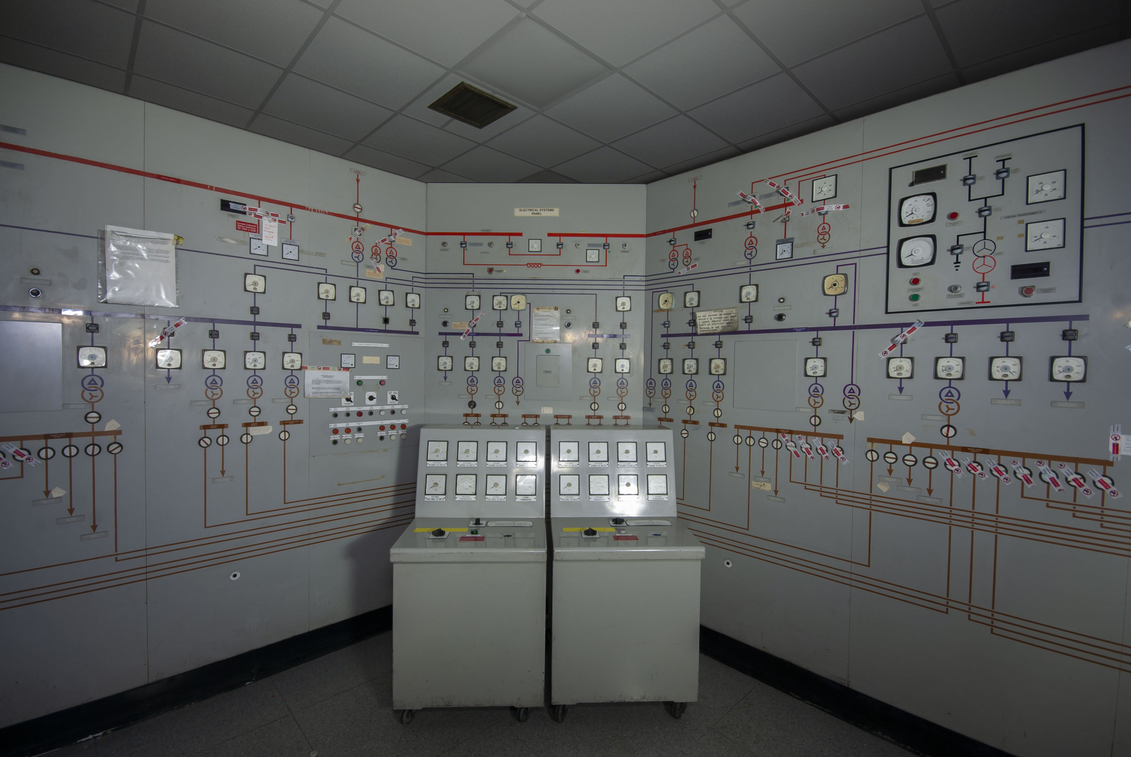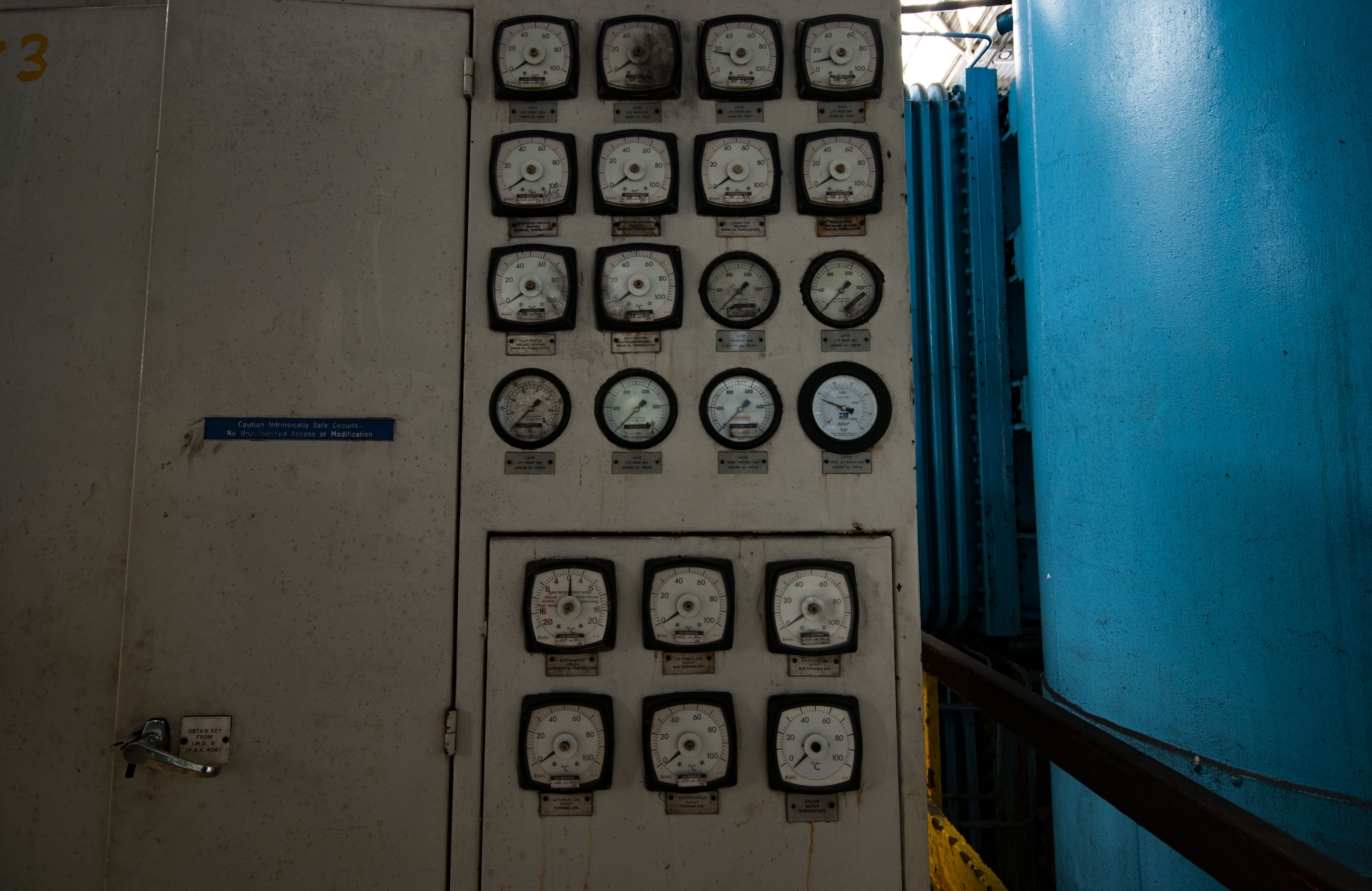 In the mid 2000s, the power station’s control systems were updated from the CUTLASS hard desk computer systems (control dials, buttons, knobs etc) to the more modern APMS (Advanced Plant Management System) which was developed by RWE to modernise the control of power stations. Many UK power stations were retrofitted with this system, for example: Ironbridge, Eggborough (part APMS), Didcot (part APMS), Fiddler’s Ferry, Drax, Ratcliffe-on-Soar etc. The last unit at Aberthaw to be converted to the new Advanced Plant Management System was Unit 8, which was shut down back in the summer of 2008 to facilitate the modernisation works. This resulted in the loss of the vast array of dials and switches. Which from a photography point of view is a massive shame as these old style control rooms make for fantatsic photography opportunities with all those lovely dials and buttons and switches.