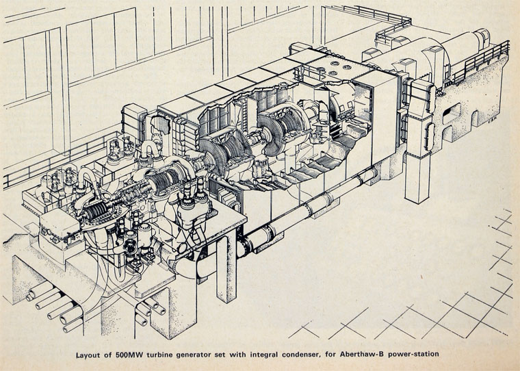 Aberthaw A was decommissioned in 1995 and subsequently demolished bit by bit – the last sections to be brought down were the chimneys. The switch house of the A side still survives to this day and is in use as a National Grid substation. Aberthaw B, the surviving and much grander big sister to the A side, was begun in 1967 and commissioned in 1971. The B Station comprises of three units, with three Foster-Wheeler boilers and three Associated Electric Industries turbo-generator sets. Each generator outputted 500MW, which meant the B Station generated a gross output of 1,500MW of electricity, with a further 60MW supplied from the three Rolls Royce Olympus gas turbines in a building to the east of the chimney. The station was efficient and very much a flagship of the 500MW turbo-generator fleet, being one of the most modern and grandest power stations at the time of its construction.