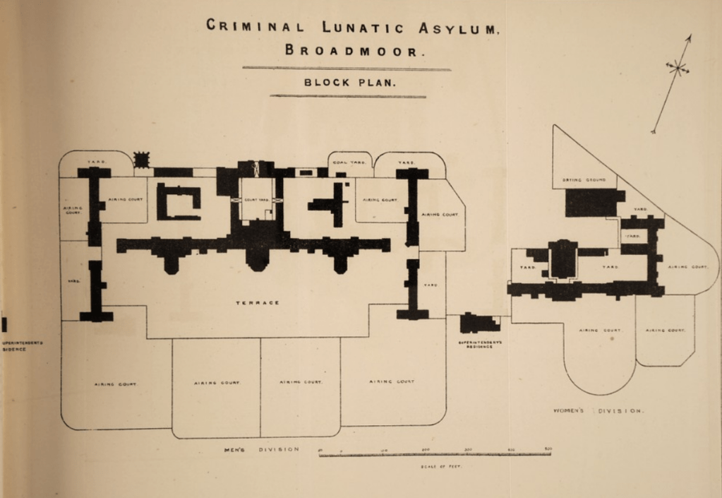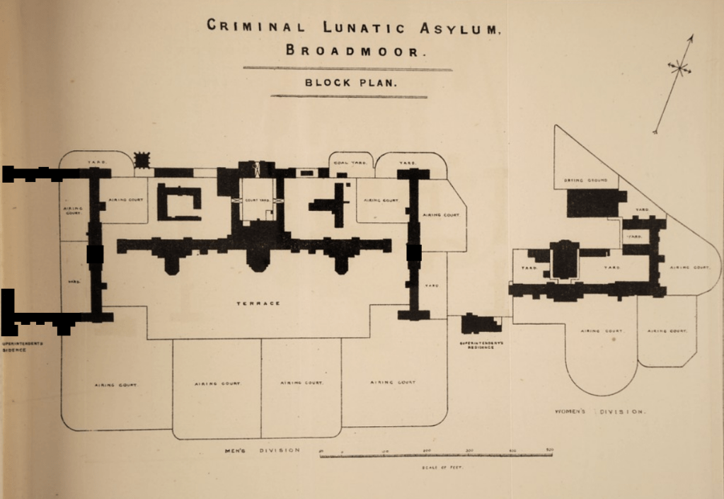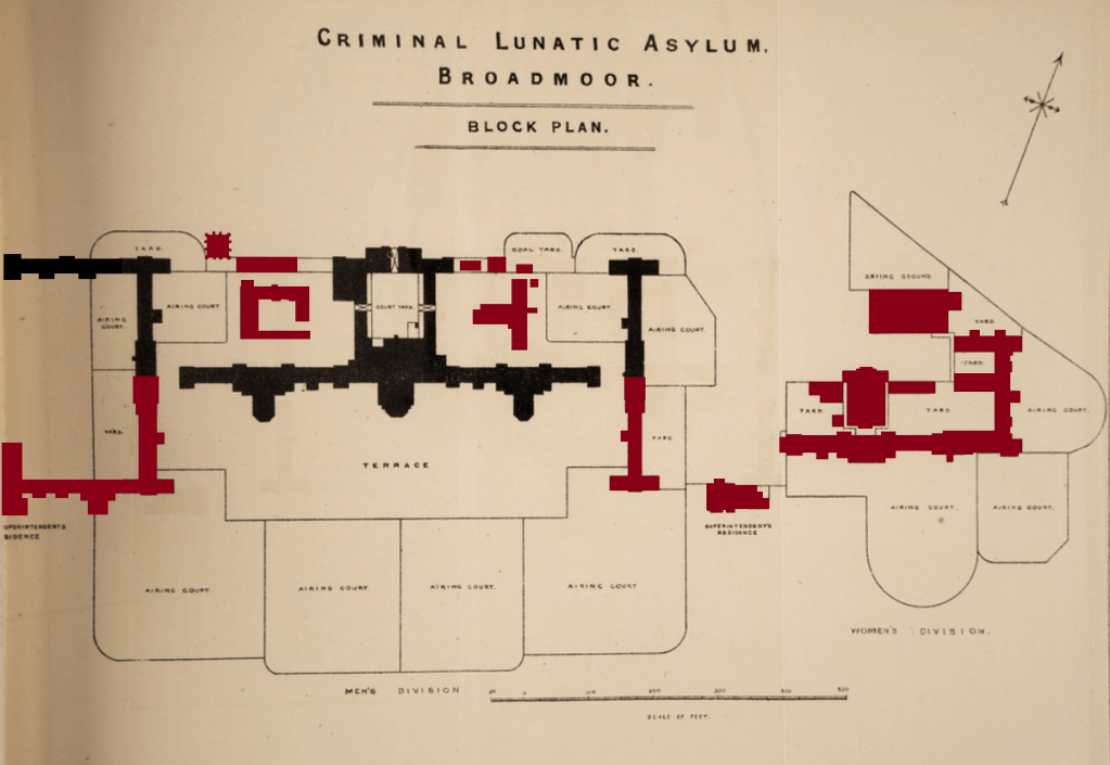Below: Broadmoor as it was with the extensions to the wards (edits by me).