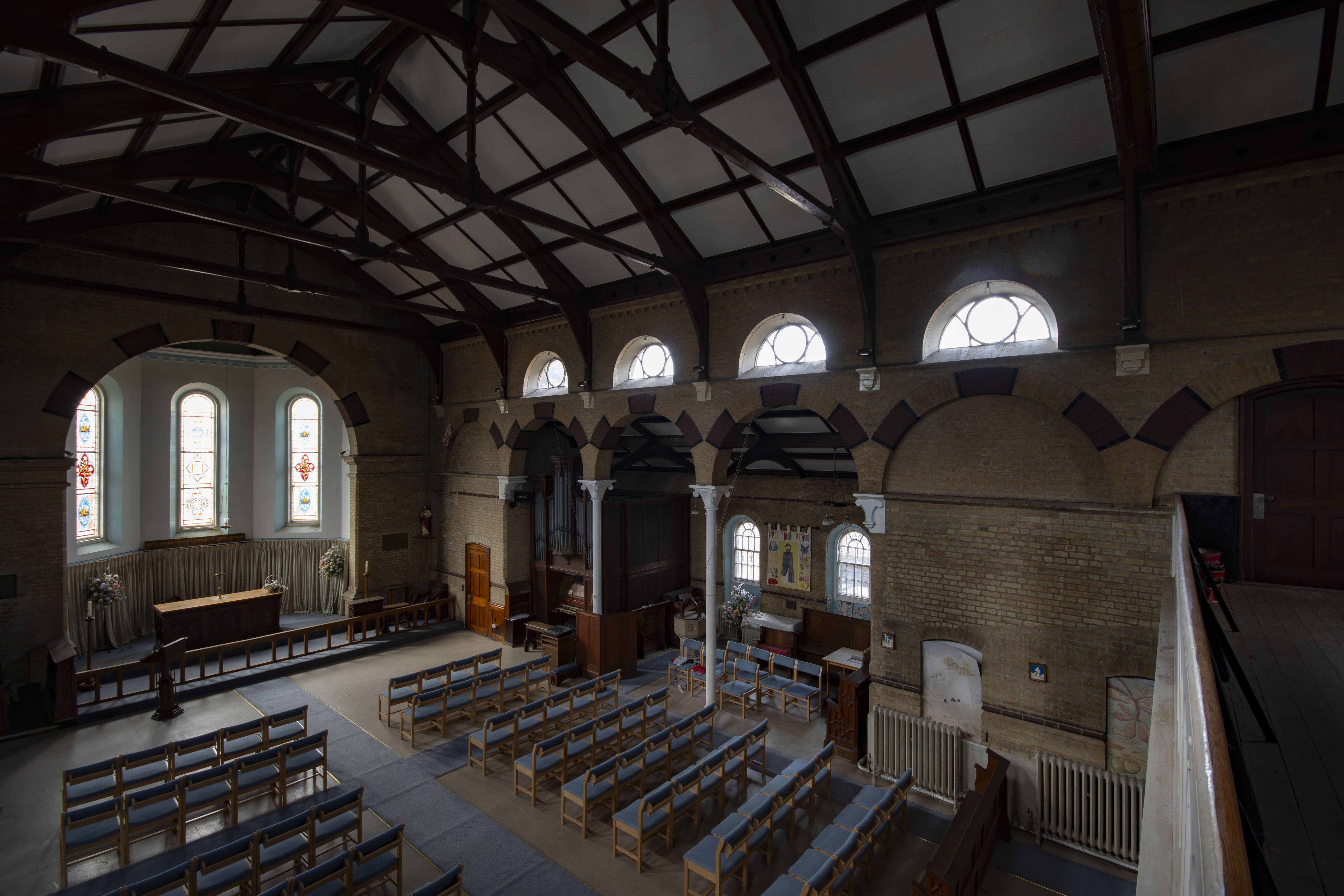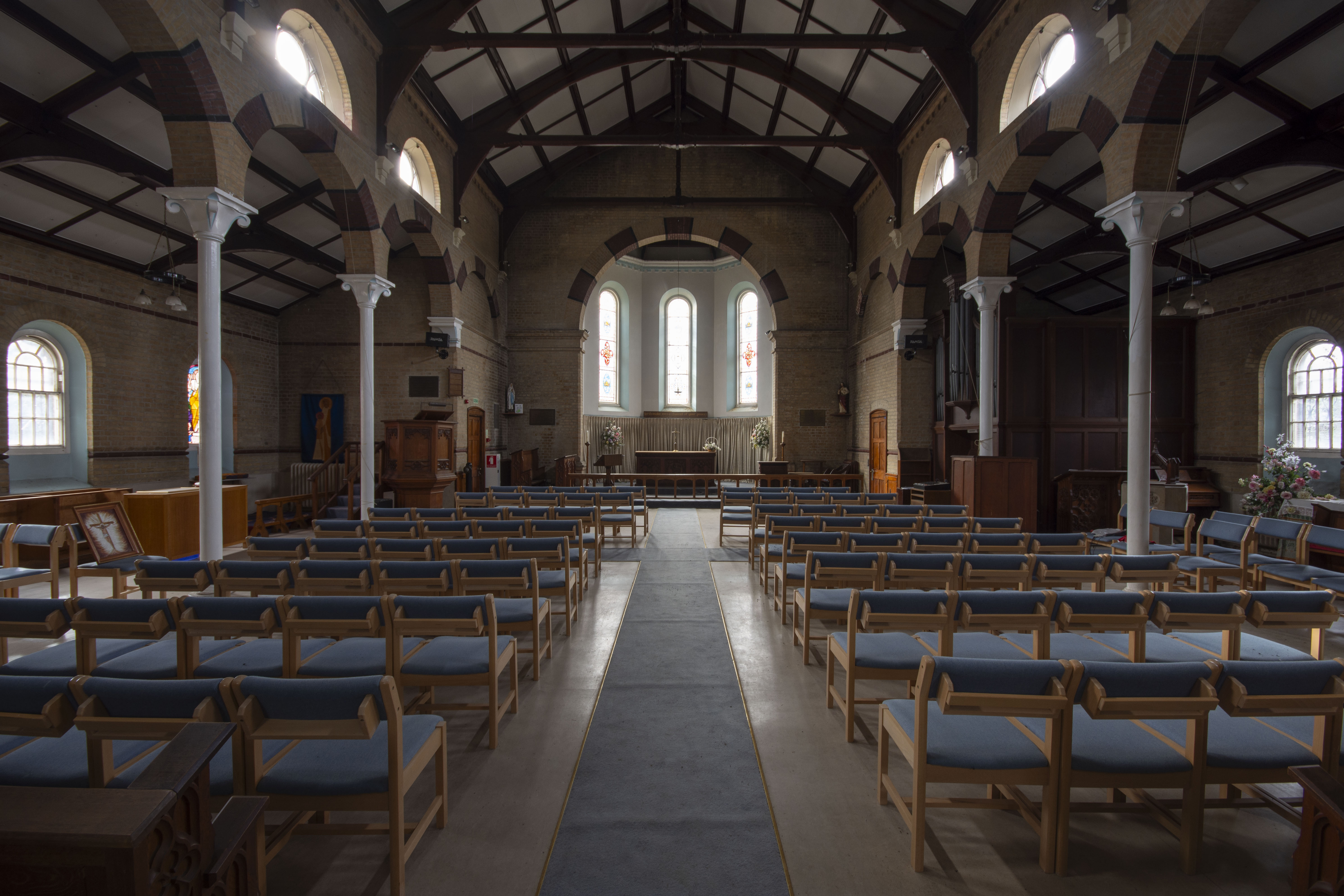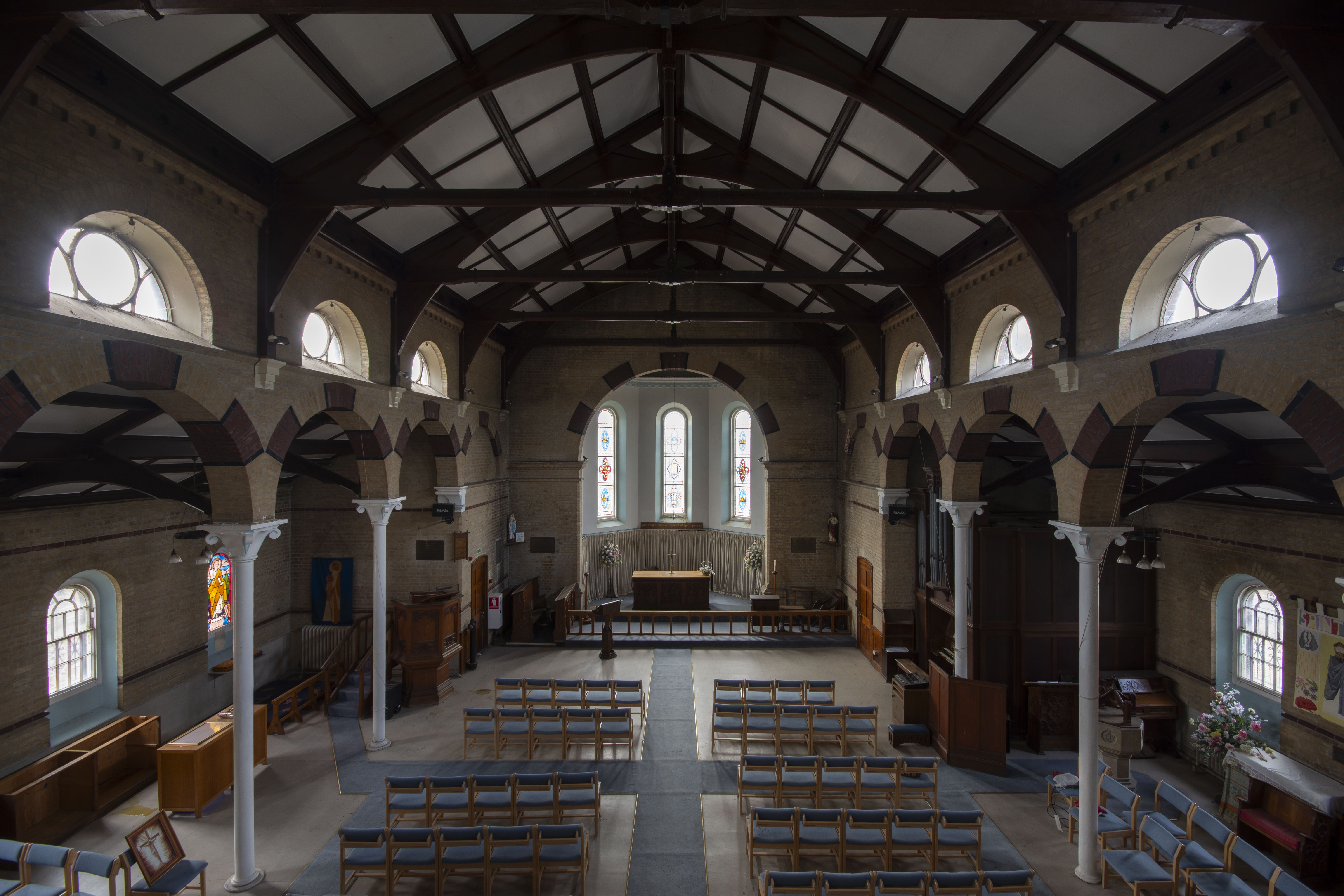 A Lombardic Romanesque Revival style with much polychrome brickwork inside.