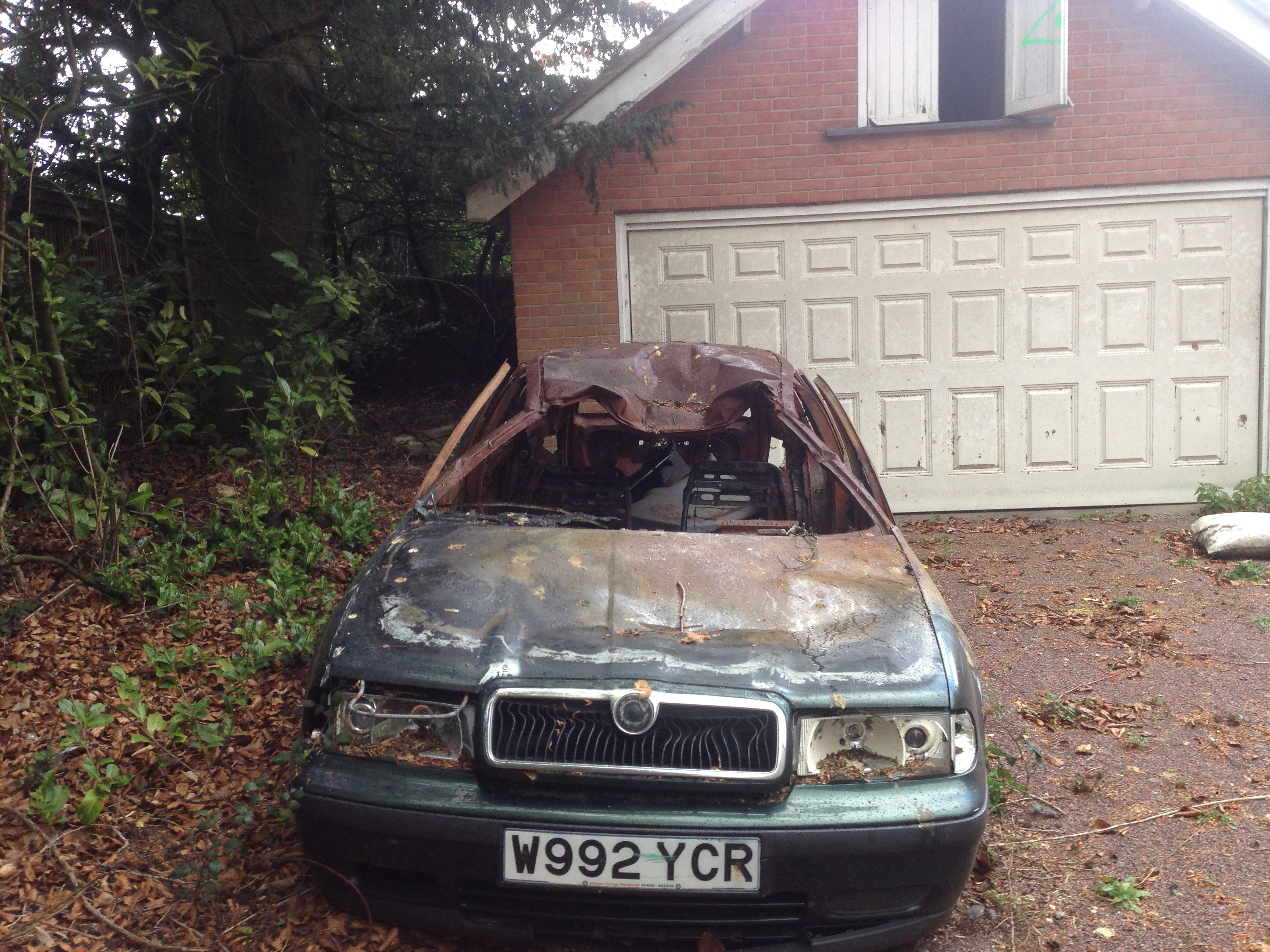 It is a large building and the inside is blackened by smoke particles. It is a very grand building and has some very ornate plaster-work, despite its fire damaged state. You can gain access to the building by climbing on through a window. This entrance only takes you round half of the building’s lower floor as the stairs have been burned away. If you go round the back, you see a door that goes into the building. You can’t miss the door as there is a burned out Skoda Fabia near it.