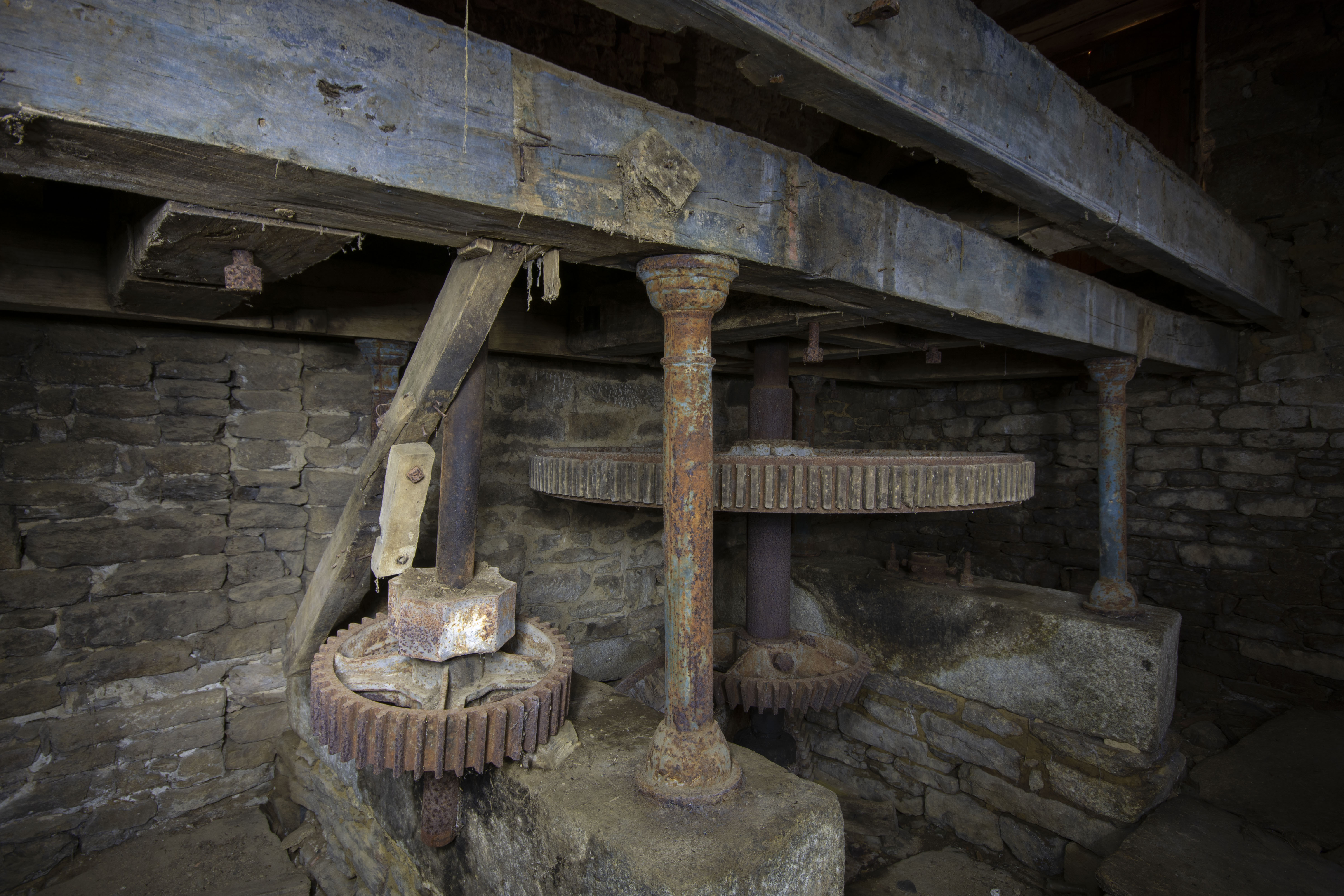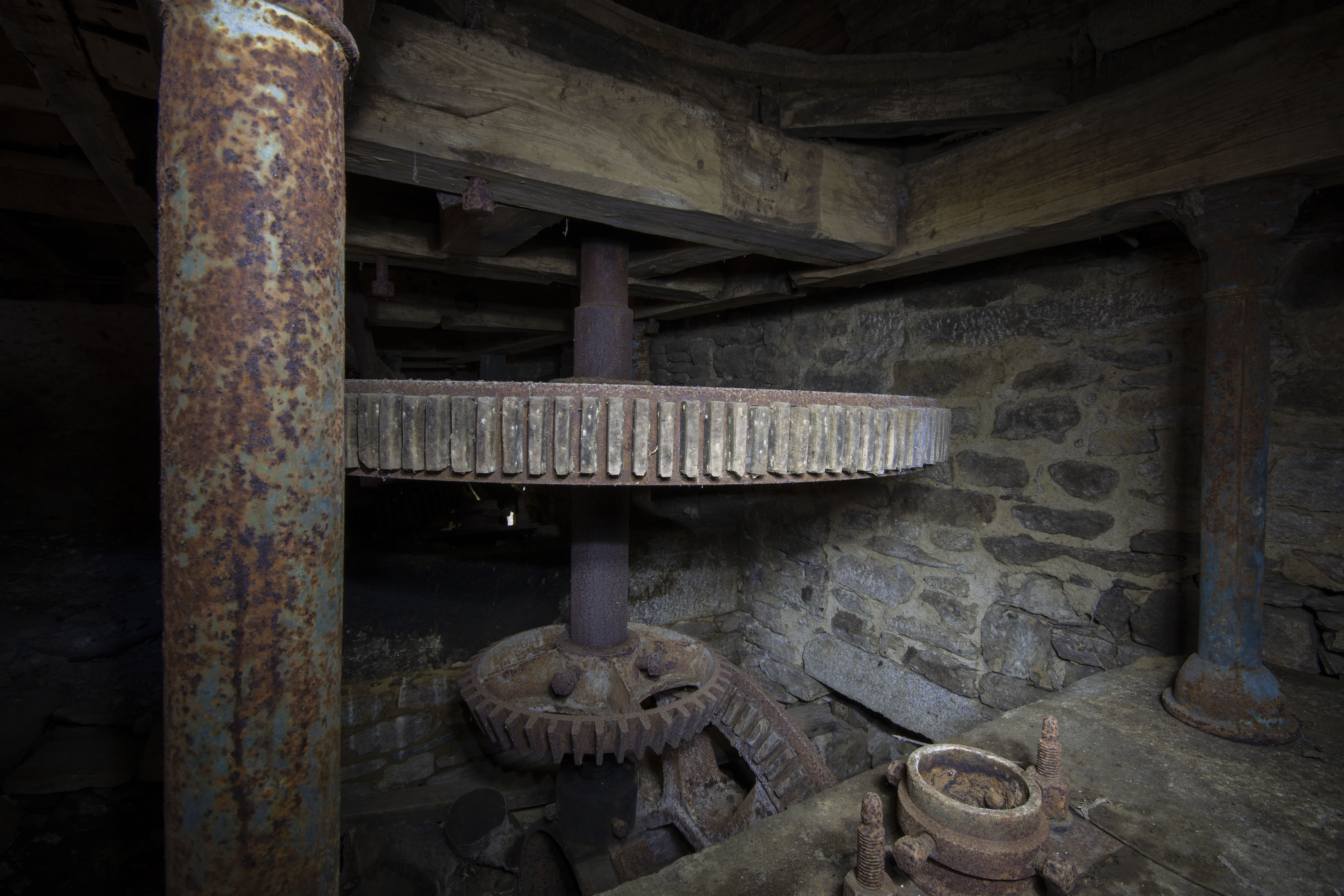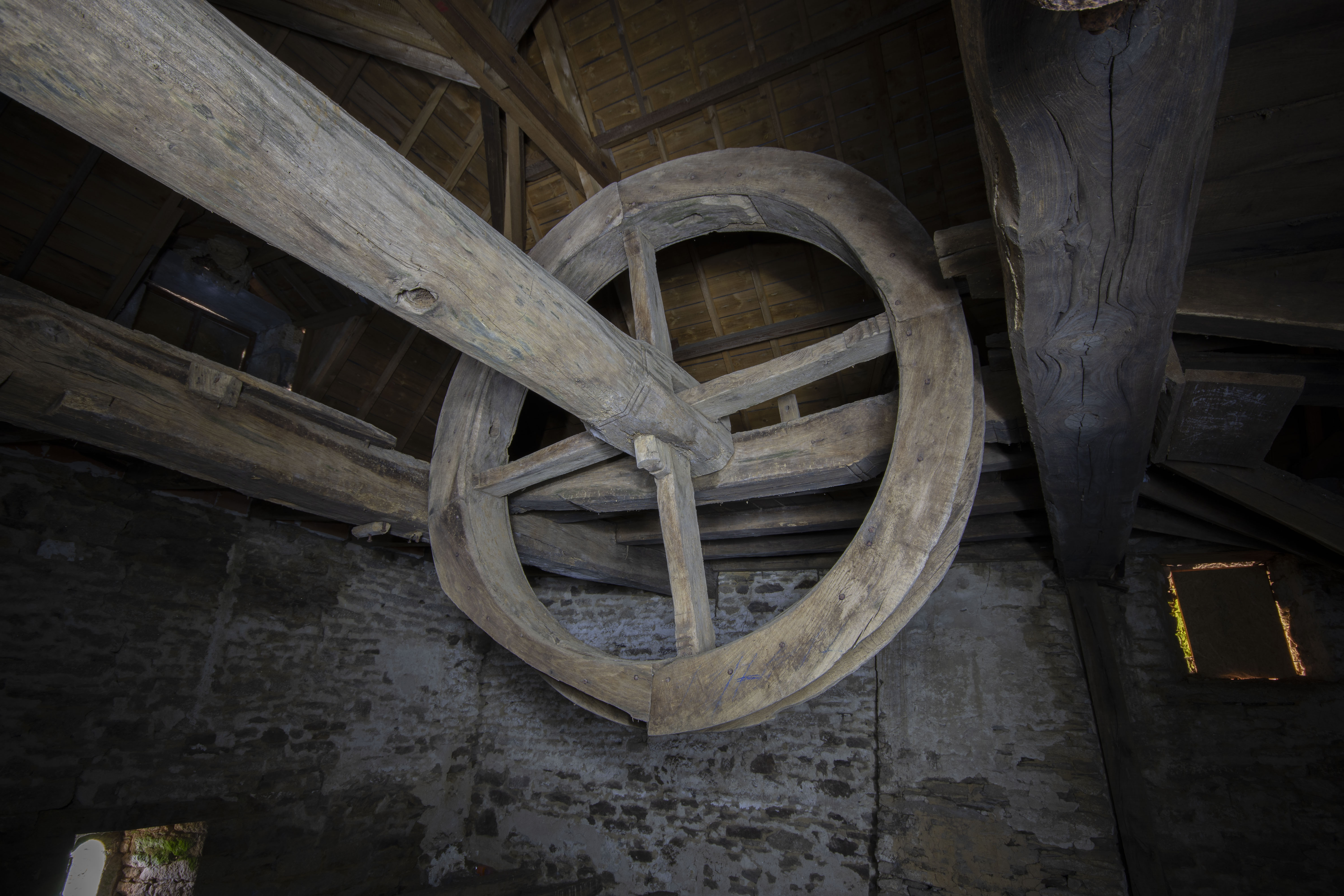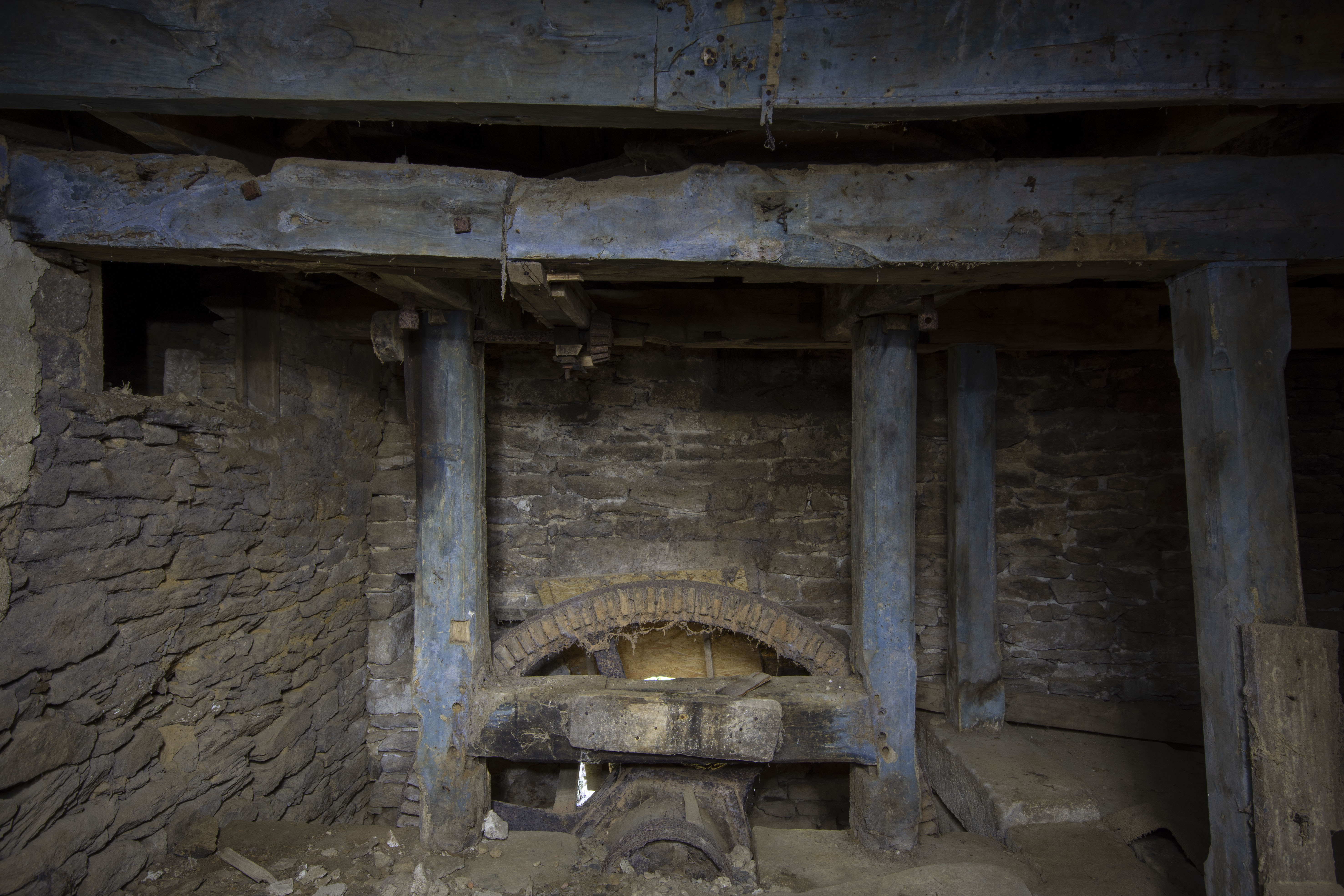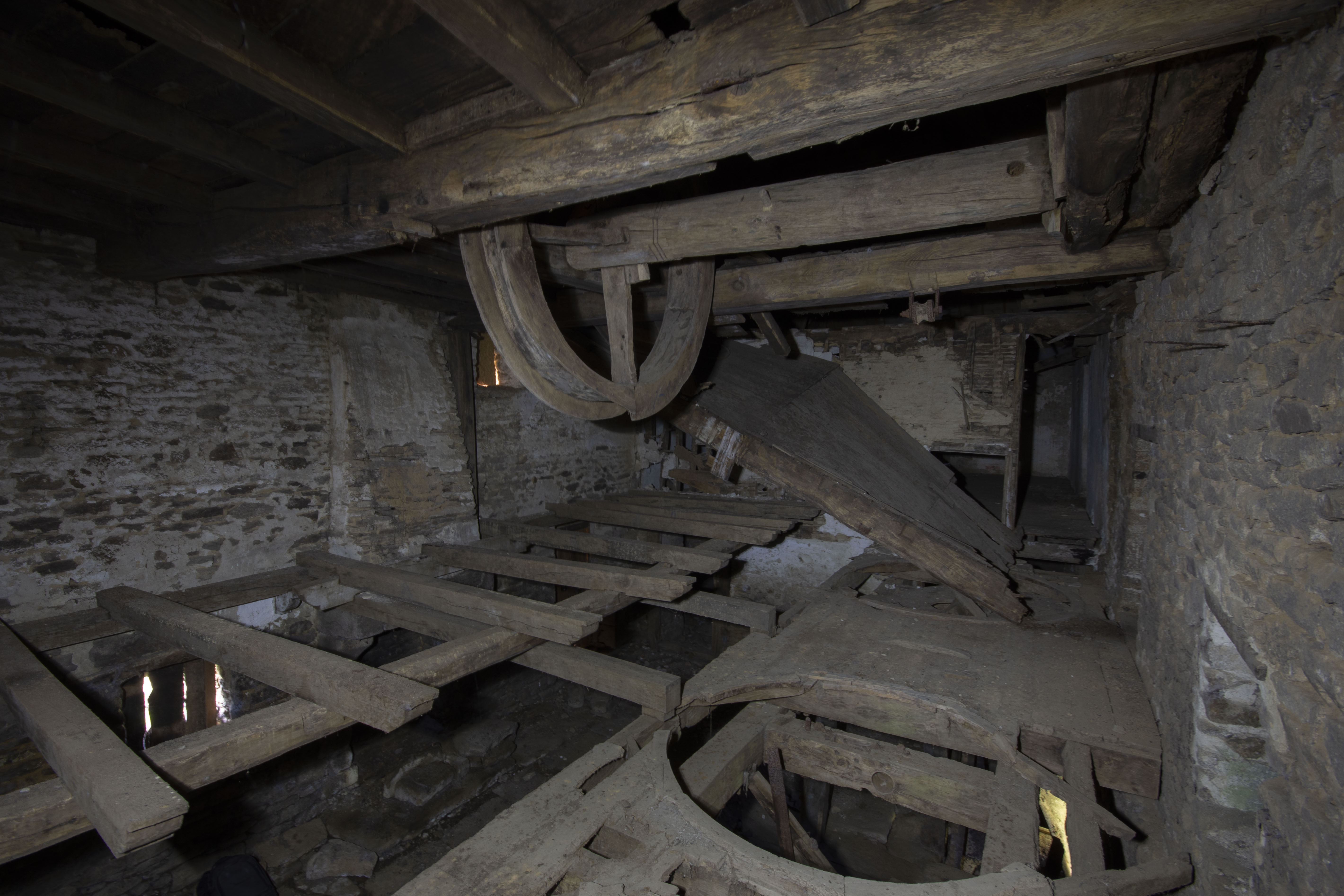 At some point in the 19th century, one of the water wheels was retired and the eastern milling set was remodelled so that the wheel powered two pairs of millstones instead of one – the other wheel (the middle water wheel) was left driving one pair of grinding stones only. The milling machinery on the newer set is identical to that of the Moulin B, so I can safely assume it was the same millwright. The mill was in operation until sometime in the 20th century. After milling ceased, the water wheels were removed and the eastern wheel’s shaft aperture was bricked up. At the same time the millstones were removed. The mill has lain derelict since and there are no plans for its restoration.
