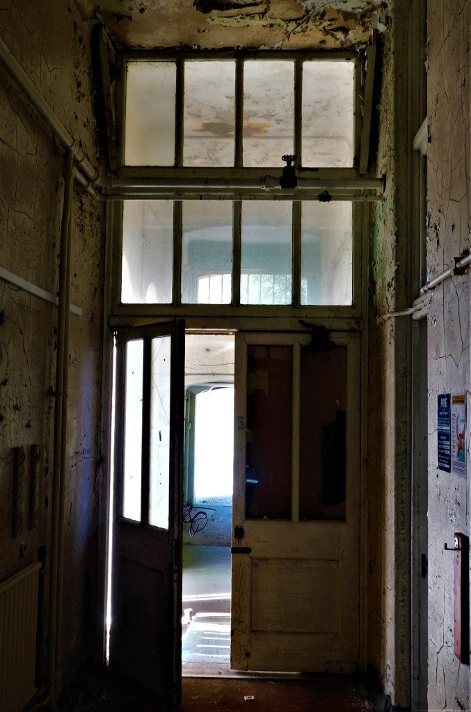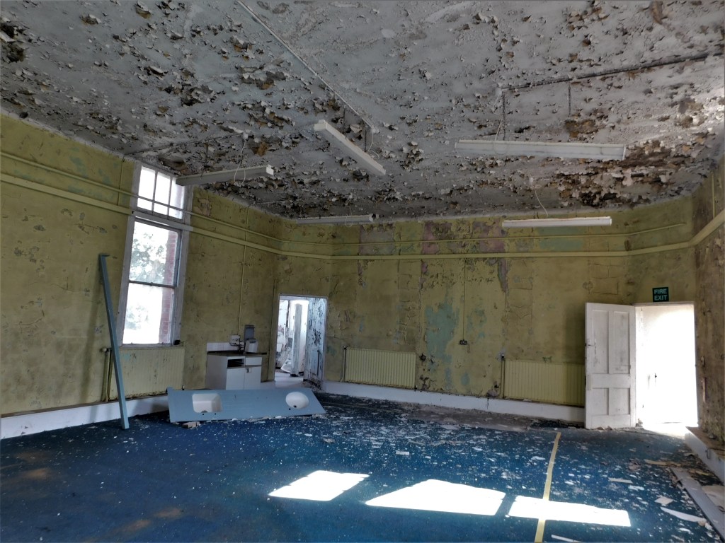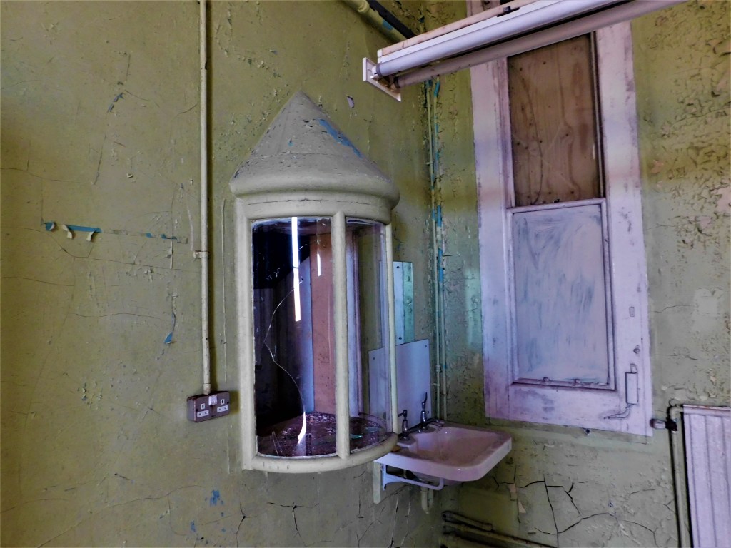 September 2019: The day before I started university, I went with a friend down to Portsmouth to attempt various sites, including Haslar. What we were not expecting was that a heritage open day tour of the exterior of the hospital was going on. So once over the fence and in the grounds, we were confronted by various tour guides! A quick dash and we hid inside what I can only assume was mental health wards due to the similarity in design to asylum architecture – the hospital site formerly included an asylum for sailors with mental health disorders. Those were rather interesting and clearly early 20th century. They were partly boarded up, but that didn’t matter too much. Thanks to the really high security, not many vandals have got on site so the decay is mostly natural which is lovely. Soon after we exited the outlying wards, we were clocked by security who had been alerted to our presence by the bloody tour guides! We were then caught and promptly turfed off site. Well. I say “we”. I was caught and my exploring acquaintance legged it and left me (in his typical fashion). But the silver lining was, after an attempt at intimidation and threats by an acid tongued security woman who rode around on a bike with a wicker basket, that I was given a lift around the front to see the lovely stone frieze on the pediment of the older main building and then given a lift back to where my exploring acquaintance and I had parked the car!