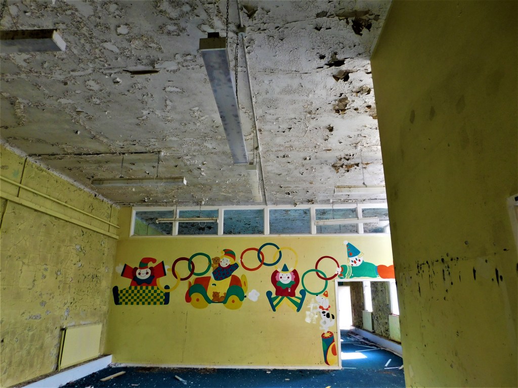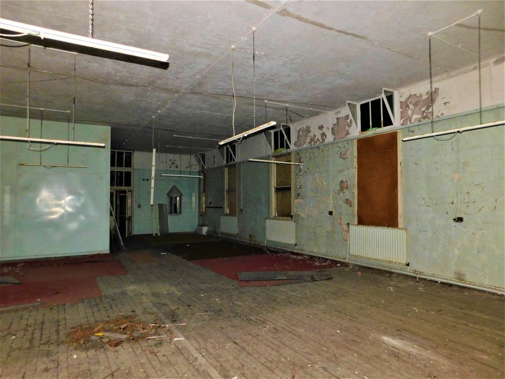 The ground floor of the hospital has a large gymnasium full of peeling paint.