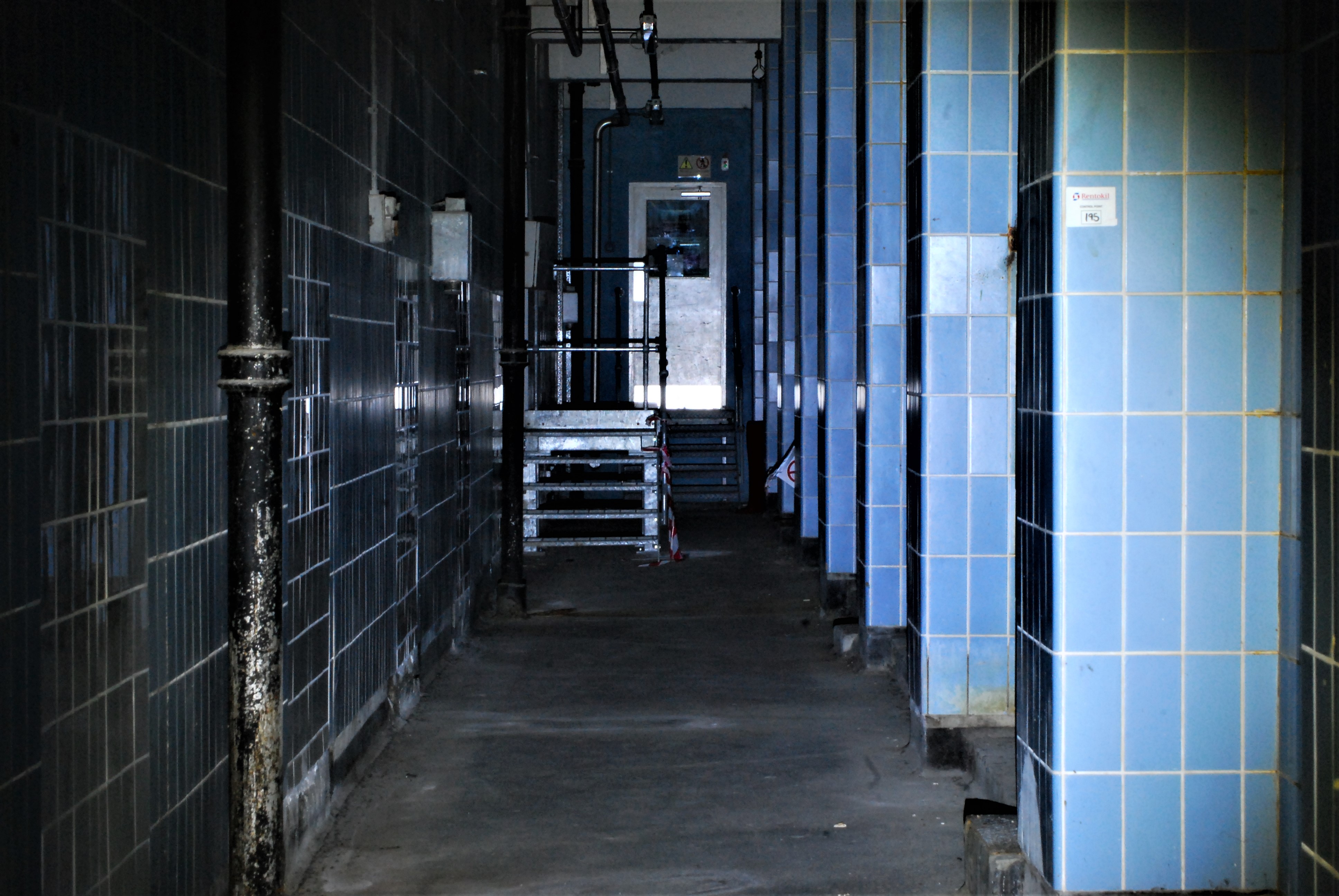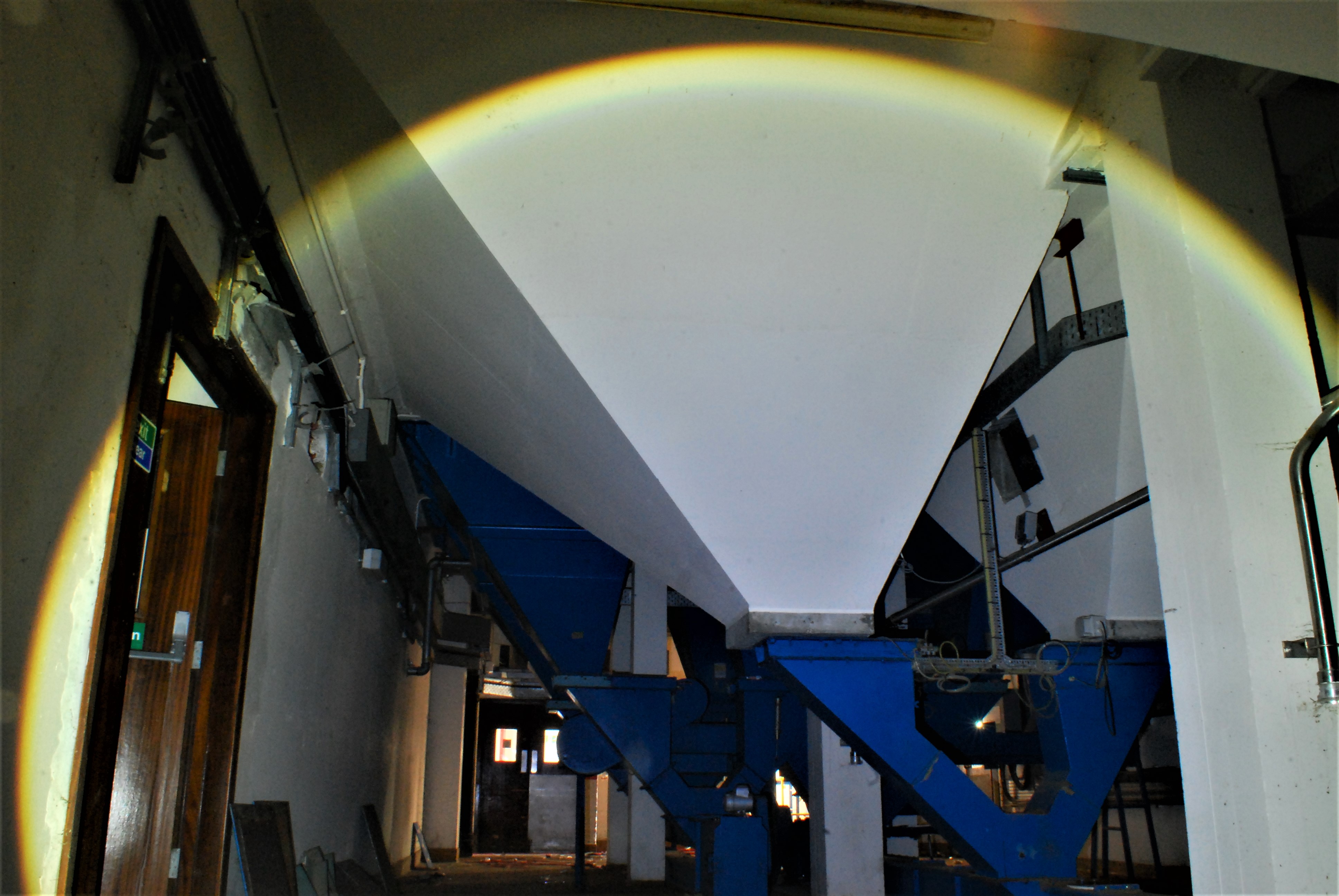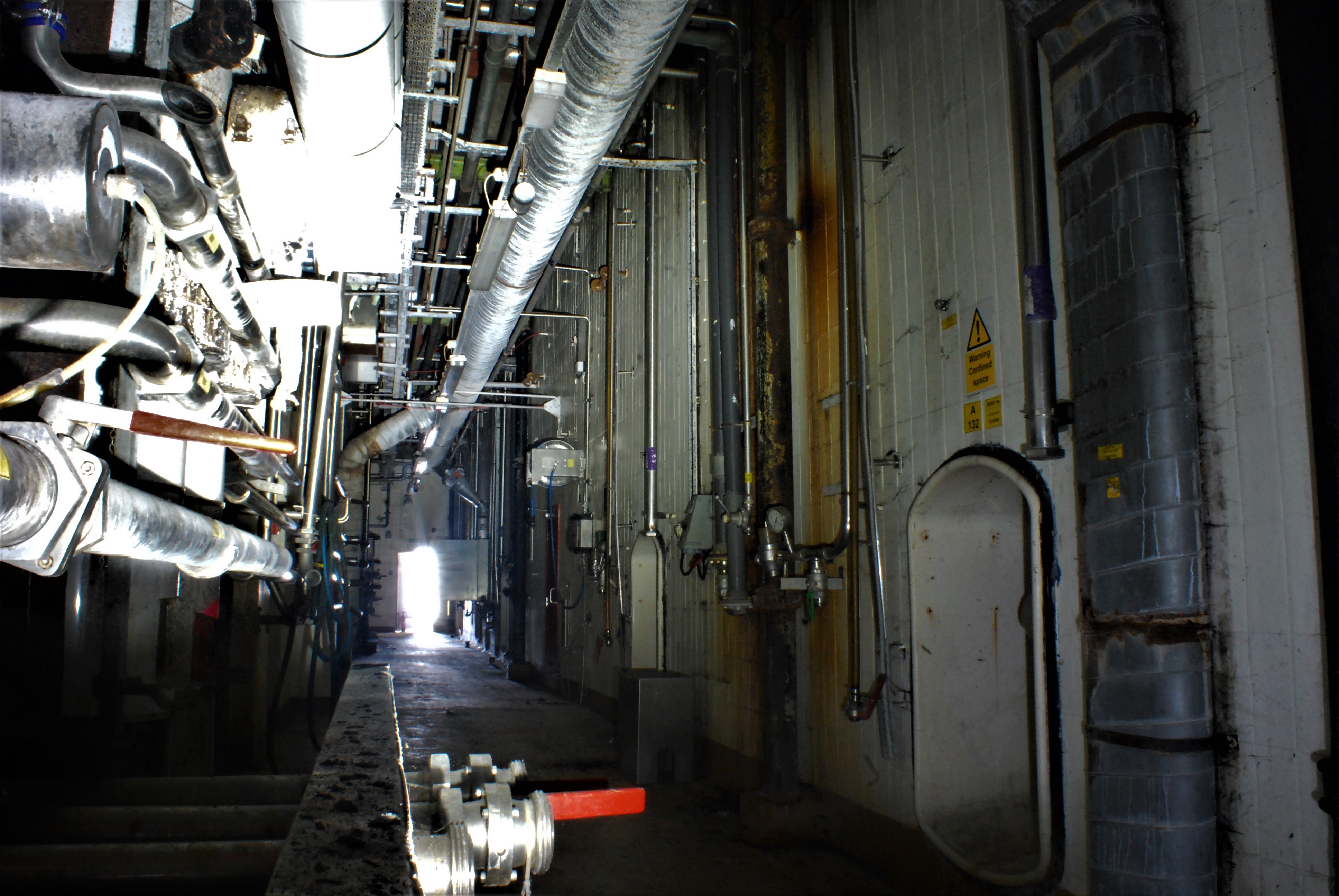 We then spent about half an hour looking around and scouting, with the first building we looked at being the boiler house. There were three massive boilers in there with auction lots posted on them. We didn’t see anyone about at all which kind of lulled us into a false sense of security (pun not intended) as you will later read! Access to the actual brewhouse was an absolute mission, but nevertheless we got inside (with much difficulty I must add, involved a lot of caution because of my hand!) and mooched around for a good three hours. There was no electricity at all so we were reliant on torchlight. The interior was very reminiscent of a cave – dark, echoey, dank and musty. The highlights were the conical bases of the brewing vats. Sadly, we didn’t get to see the control room as it was in its heyday. It had been stripped out. But much of the machinery was still in situ within the actual brewhouse part so that made up for that loss. The tanks themselves were enormous. All of them had the hatches open so I stuck my head in one and made a few silly sounds to listen to the echoes. Pretty good place to record sound effects! The rest of the explore was nice and chilled until the following…